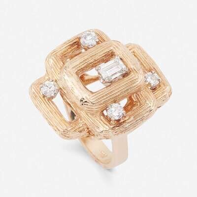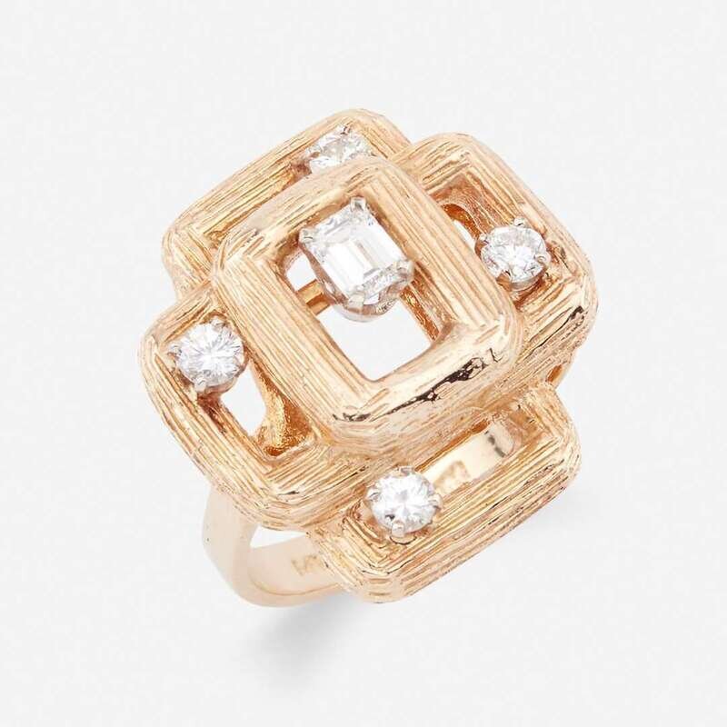 a textured open form geometric design, accented by emerald and round brilliant-cut diamonds; estimated total diamond weight: 0.90 carat.