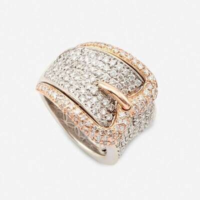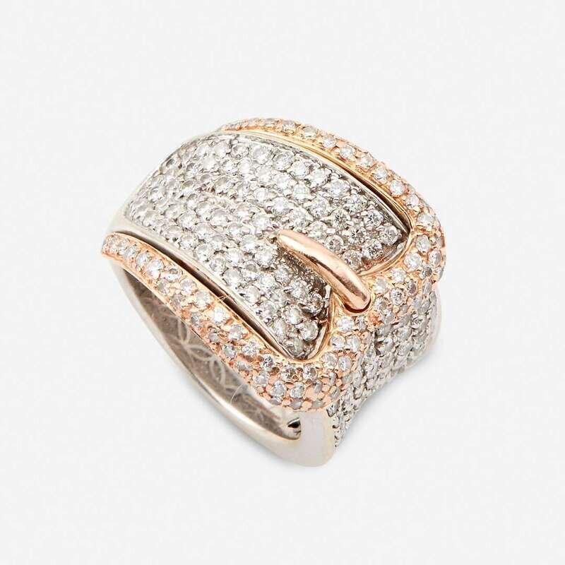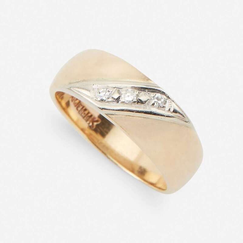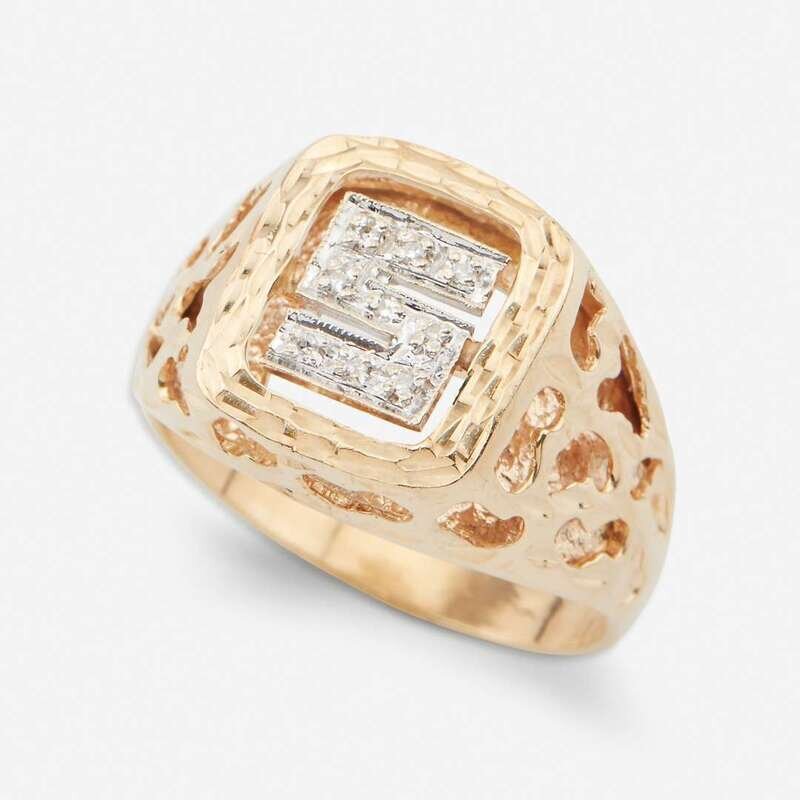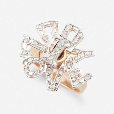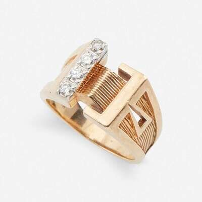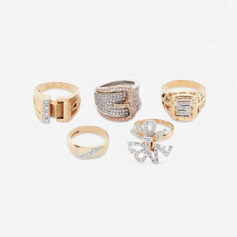 including a fourteen karat white and rose gold ring designed as a buckle, set throughout with round brilliant-cut diamonds; a gentleman's geometric design set with four round brilliant-cut diamonds; a gentleman's initial ring, the "S" set with single-cut diamonds; a single-cut diamond set swivel ring stating "I Love You;" and a gold band set with three single-cut diamonds.