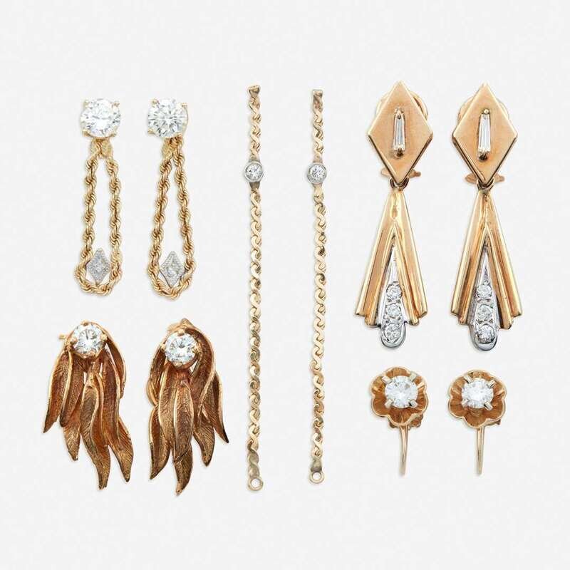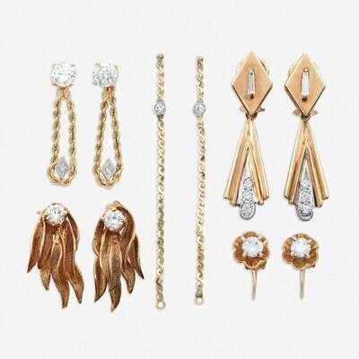 one designed as a group of feathers set with a round brilliant-cut diamond, each weighing approximately 0.40 carat; a pair of round brilliant-cut diamond studs, each weighing approximately 0.70 carat, with detachable gold rope and and single-cut diamond drop; a pair of "hugs" designed as flowers centering a round brilliant-cut diamond, each weighing approximately 0.30 carat; a pair of geometric drop earrings set with baguette and round brilliant-cut diamonds; and a pair of flattened twisted gold rope drop earrings bezel-set with a round brilliant-cut diamond.
