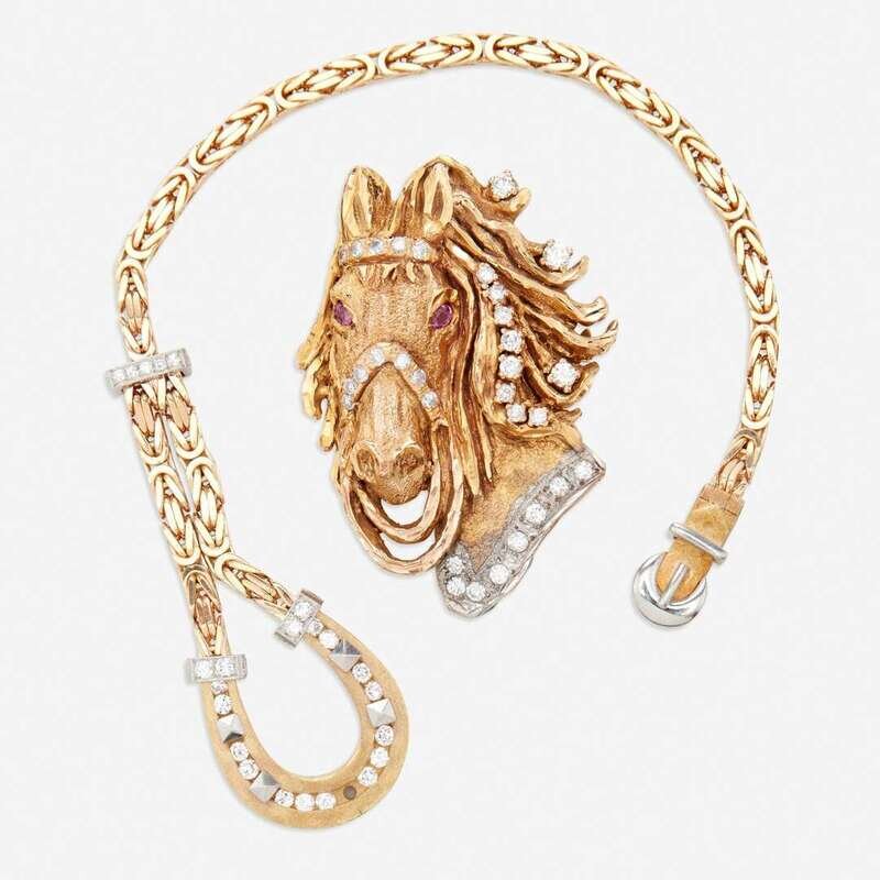 the eighteen karat gold and platinum bracelet designed as a byzantine box chain with matte gold horseshoe and buckle clasp, set with round brilliant-cut diamonds, estimated total diamond weight: 0.50 carat; and a fourteen karat gold pendant/brooch designed as a horse head with circular-cut ruby eyes, and round brilliant-cut diamond accents throughout, estimated total diamond weight: 0.80 carat.