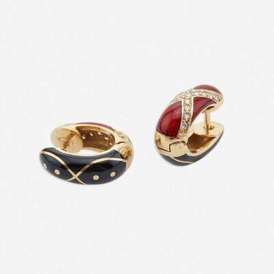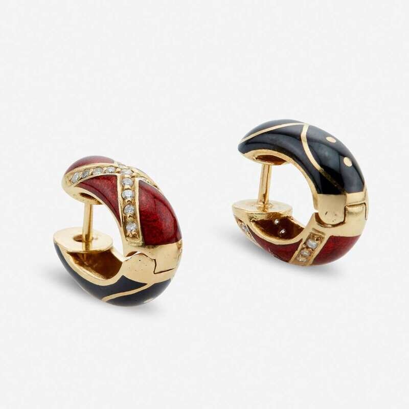 A pair of eighteen karat gold, enamel, and diamond earrings