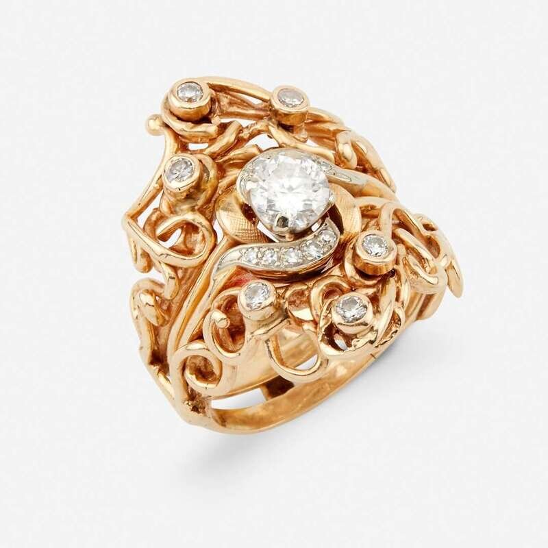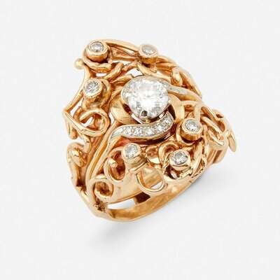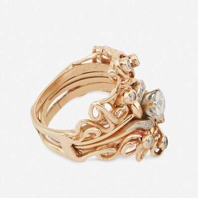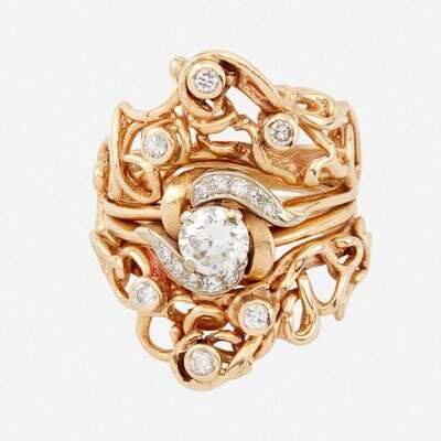 including a diamond solitaire centering a round brilliant-cut diamond weighing approximately 0.70 carat, surrounded by single-cut diamonds and textured gold; together with a freeform gold and bezel-set circular-cut diamond insert ring.