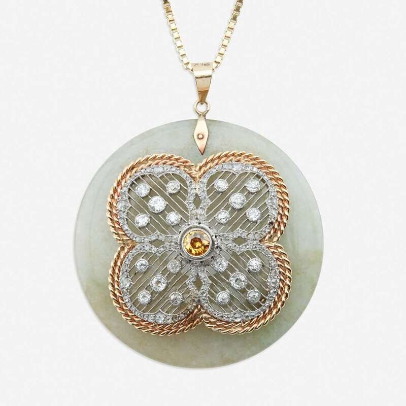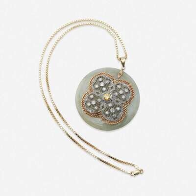 A white jadeite jade, yellow diamond, diamond, platinum, and gold pendant