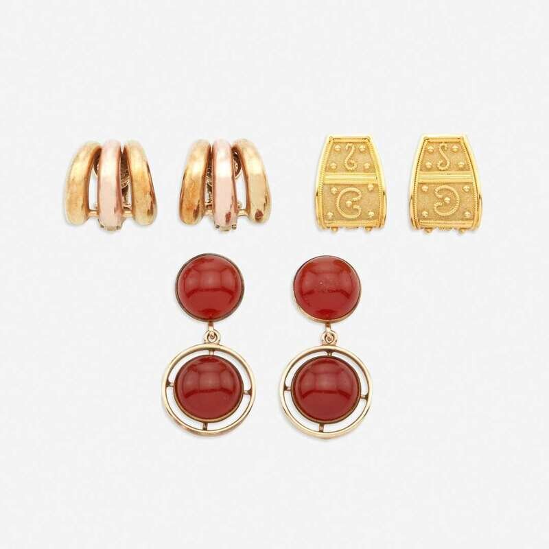 including one pair of eighteen karat gold half hoop earrings with Greek inspired design; one pair of bi-color rose and yellow fourteen karat gold half hoop ear clips; and one pair of earrings with circular cabochon carnelians bezel-set in fourteen karat gold, each suspending another circular cabochon carnelian.