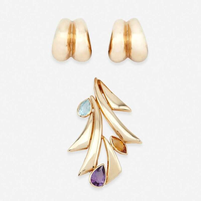 the ear clips designed as graduated half hoops in fourteen karat gold; the brooch designed as ten karat gold spray bezel-set with a pear-shaped amethyst, a marquise-cut citrine, and a pear-shaped blue topaz.