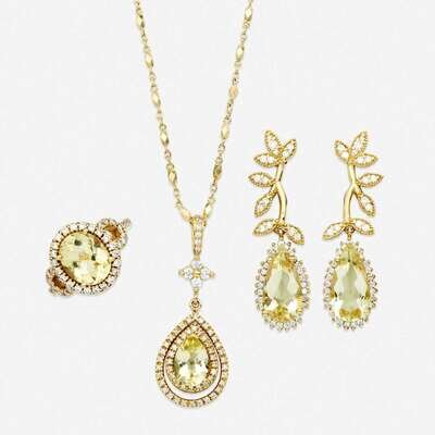 including a pendant set with a pear-shaped yellow beryl weighing approximately 1.90 carats, accented by two rows of round brilliant-cut diamonds; a pair of drop earrings with a foliage motif set with pear-shaped yellow beryl weighing approximately 3.00 carats each, accented by round brilliant-cut diamonds; and a ring centering an oval-cut yellow beryl weighing approximately 3.10 carats, accented by round brilliant-cut diamonds; estimated total diamond weight: 2.80 carats.