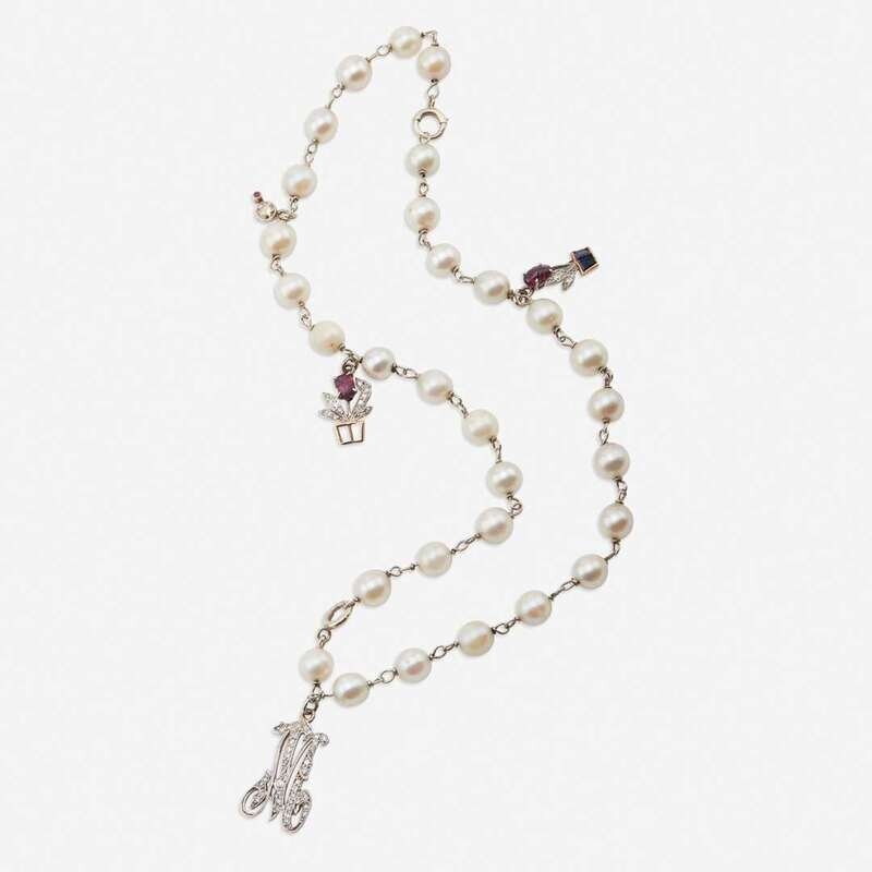 set with baroque cultured pearls measuring approximately 7.7mm, suspending four charms set in platinum and gold, two designed as flowers set with carved ruby, diamond, and synthetic sapphires (one charm deficient of sapphires), a diamond set "M," and a circular-cut brown diamond weighing approximately 0.25 carat.