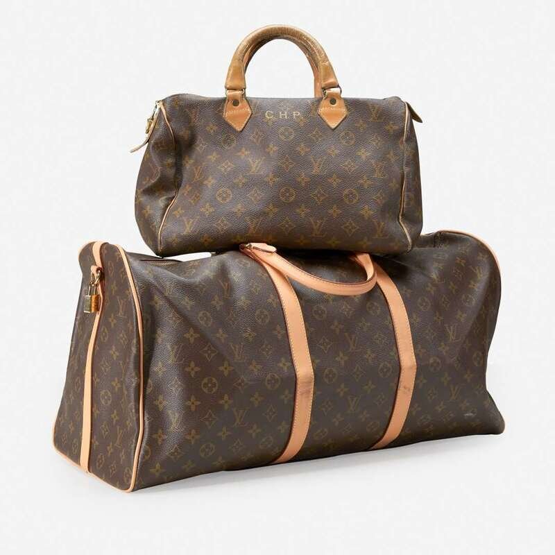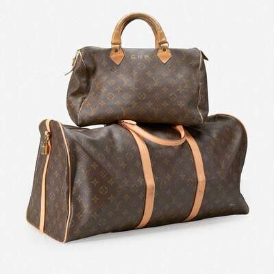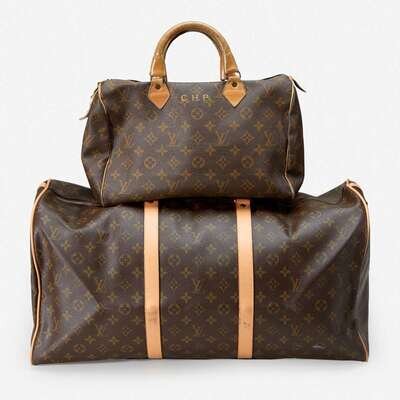 one a monogrammed canvas and tan leather duffle bag, the other a monogrammed canvas and tan leather handbag.