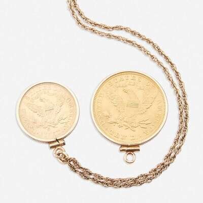one 1901 Liberty five dollar gold coin and one 1907 Liberty ten dollar gold coin, set in gold filled pendant setting.