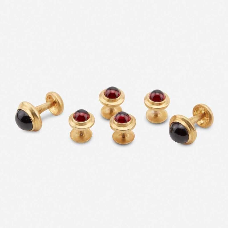 comprised of cufflinks and studs set with circular cabochon garnets.