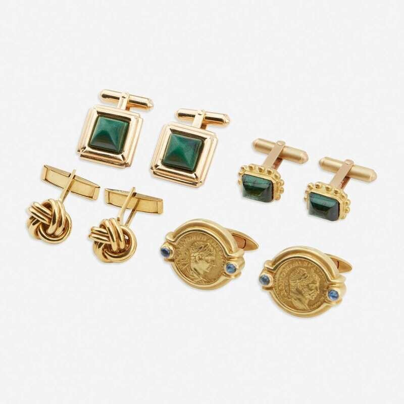 including a pair of eighteen karat gold Roman coin cufflinks accented with circular cabochon sapphires; a pair of fourteen karat gold and sugarloaf malachite cufflinks; a pair of fourteen karat gold and rectangular cabochon tourmaline; and a pair of fourteen karat gold cufflinks designed as knots.