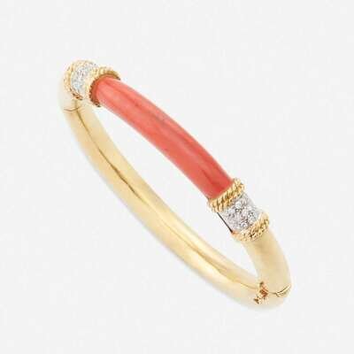 A coral, diamond, and eighteen karat gold bangle bracelet
