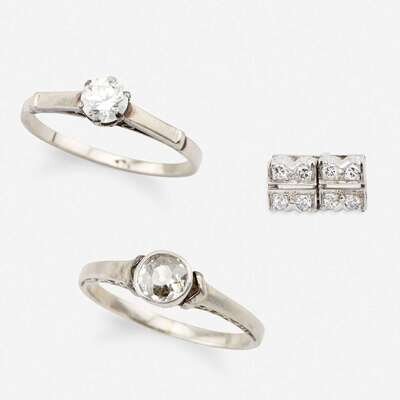 one ring set with an old European-cut diamond weighing approximately 0.45 carats; the other ring set with a round brilliant-cut diamond weighing approximately 0.40 carat; and one tie tack set with eight round brilliant-cut diamonds.