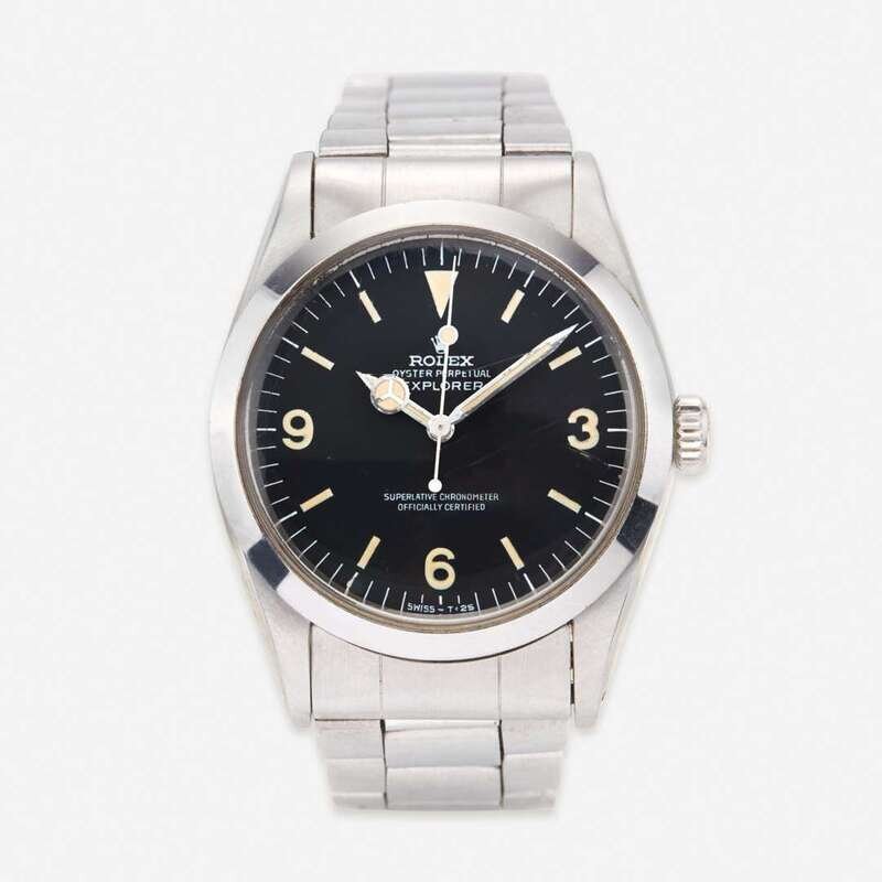 jeweled automatic movement (movement not examined), reference 1016, serial number 369282, black dial with luminescent Mercedes hands and geometric markers with Arabic numerals, smooth bezel and completed by a steel Oyster link bracelet with foldover clasp.