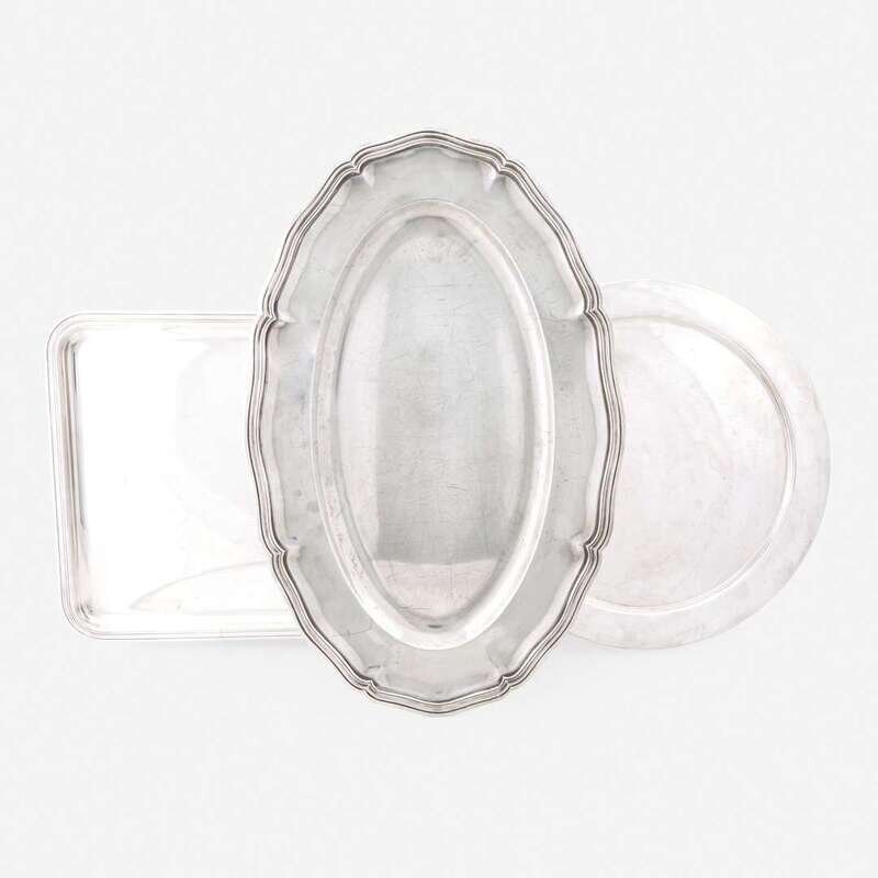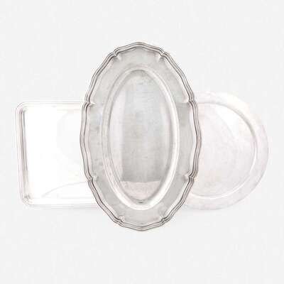 Comprising a Saks Fifth Avenue sterling silver circular tray; a Christofle silver-plated rectangular tray; and a Christofle silver-plated shaped oval platter. (3).