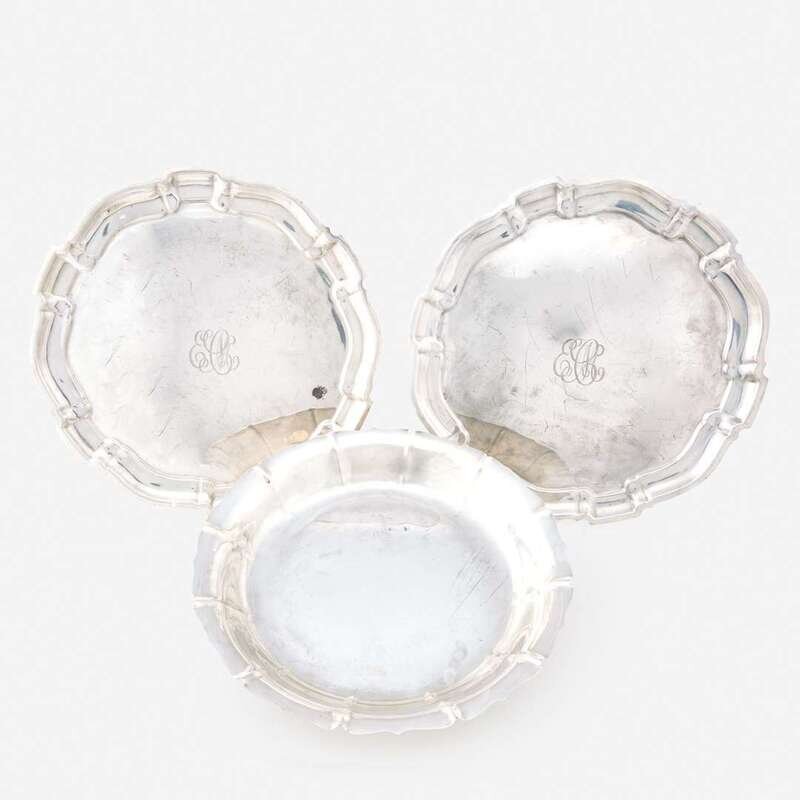 Comprising two shaped circular platters of the 'Chippendale' pattern, both monogrammed "EMC" and stamped "STERLING/by Poole/130/Chippendale;" and one sterling silver shaped circular bowl, marked "Irish Sterling." (3).