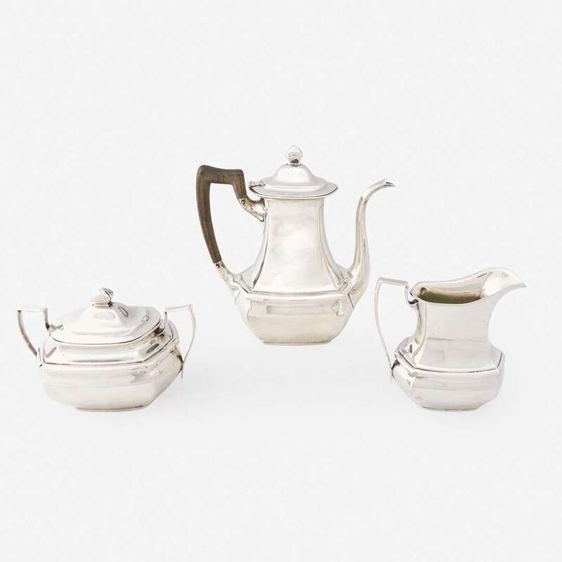 Comprising a coffeepot, covered sugar, and creamer; retailed by Maynard & Potter Inc., Boston. (3).