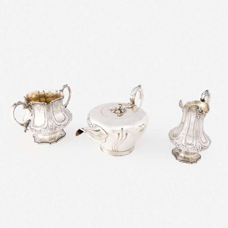 The teapot marked Thomas Henry Francis & Frederick Francis, London, 1853; the creamer and sugar by Edward, Edward Jr., John & William Barnard, London, 1844. (3).