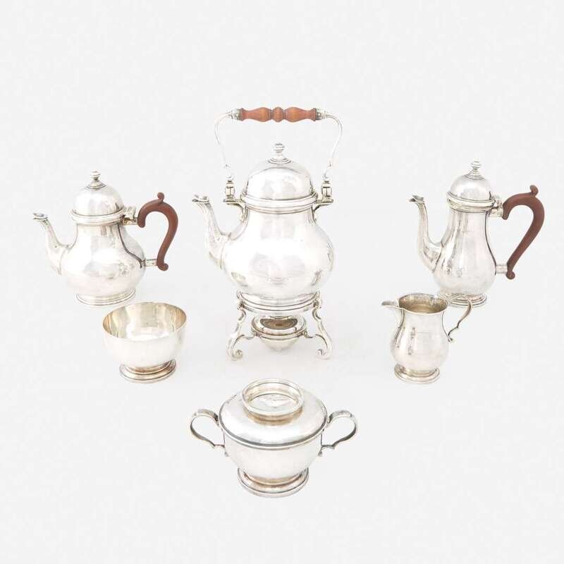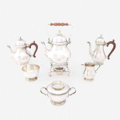 Comprising a coffeepot, teapot, hot water kettle on stand, creamer, covered sugar, and open waste bowl. (6).