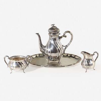 Comprising a coffeepot, creamer, sugar, and tray; the tray additionally marked for Johannes Siggaard, 1947, the remaining pieces dated 1959. (4).