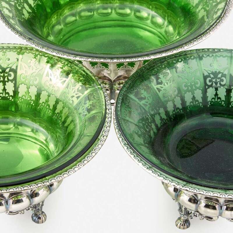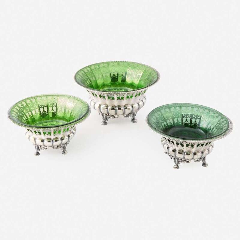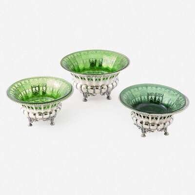 A trio of German silver pierced bowls with green glass liners Ernst Menner, Stuttgart, circa 1920s