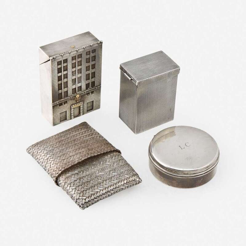 Comprising a Geroge V sterling silver card case opening to reveal two decks of playing cards, Stokes & Ireland, Chester, 1921, retailed by Aspery, London; an American sterling silver card case, modeled after the Tiffany flagship in New York, Tiffany & Co., 20th century; an American sterling silver hinged snuff box, monogrammed "L.C," Tiffany & Co., 20th century; and a Mexican woven sterling silver case, marks indistinguishable, 20th century. (4).