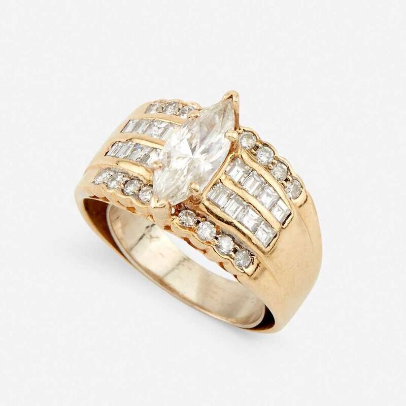 centering a marquise-cut diamond weighing approximately 1.10 carat, accented by round brilliant and square-cut diamonds; estimated total remaining diamond weight: 0.80 carat.