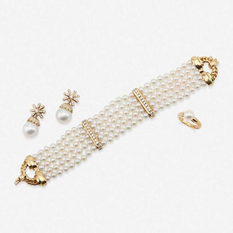 including a bracelet designed as five strands of cultured pearls measuring approximately 4.5mm with round brilliant-cut diamond set gold stations; a pair of earrings designed as floral posts set with round brilliant-cut diamonds suspending cultured pearl drops measuring approximately 12.0mm; and a ring centering a cultured pearl measuring approximately 8.0mm.