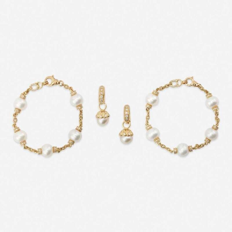 the bracelets set with cultured pearls measuring approximately 10.5mm to 10.0mm, each flanked by rhondelles set with round brilliant-cut diamonds; together with gold hoops set to the front with round brilliant-cut diamonds suspending removable cultured pearl and round brilliant-cut diamond charms.
