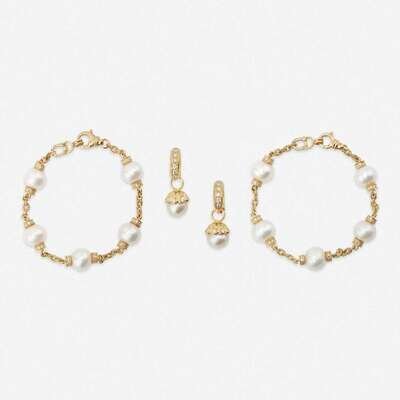 A pair of matching cultured pearl, diamond, and eighteen karat gold bracelets with matching earrings