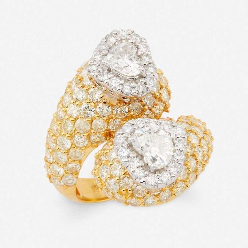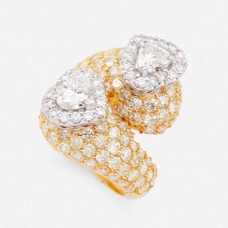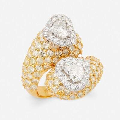 highlighting two heart-shaped diamonds weighing approximately 0.45 carat each, accented by round brilliant-cut diamonds; estimated total remaining diamond weight: 5.50 carat.