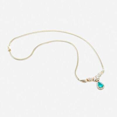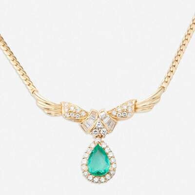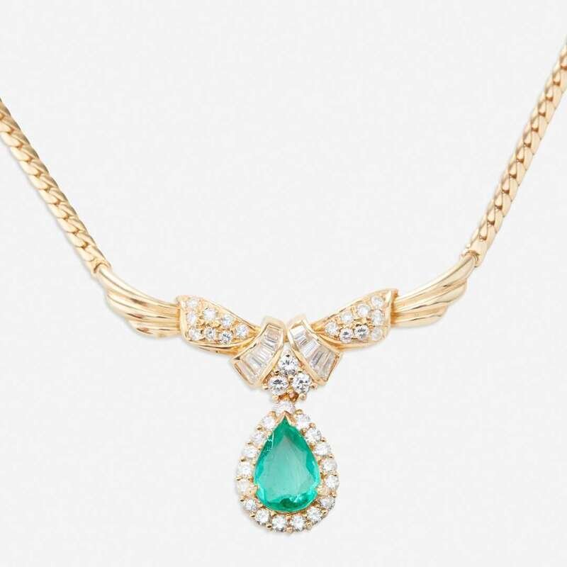 suspending a pear-shaped emerald measuring approximately 9.10mm x 6.60mm x 3.20mm, surrounded by round brilliant-cut diamonds, further accented by round brilliant and baguette-cut diamonds; estimated total diamond weight: 1.00 carat.