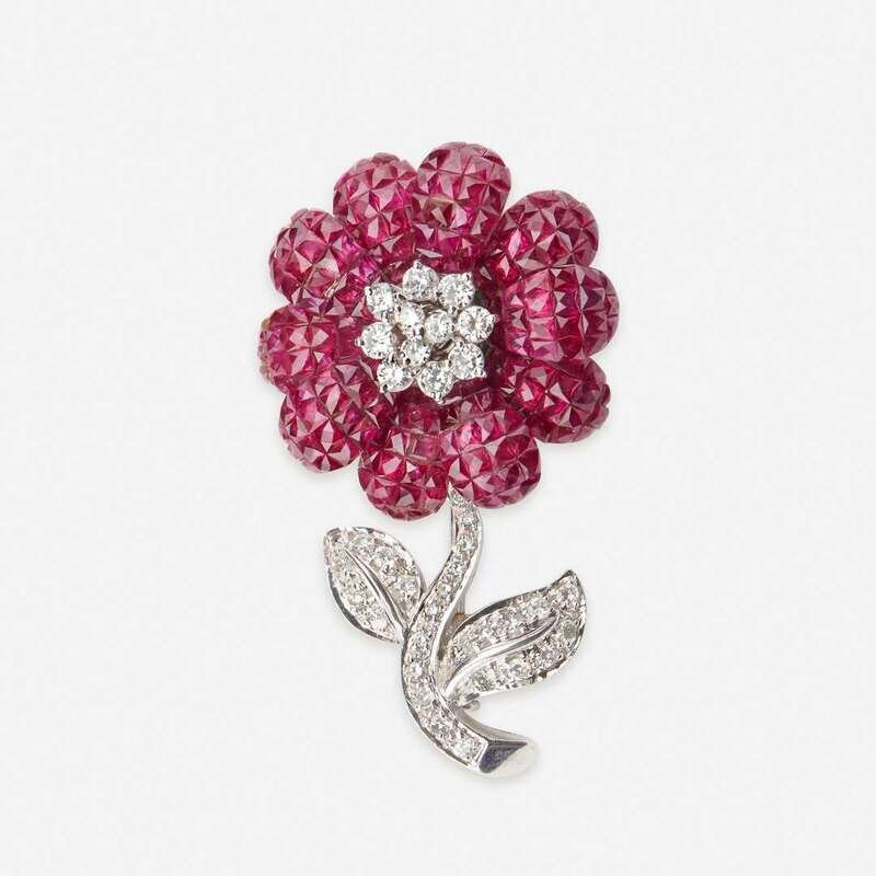 designed as a flower, the petals set with calibré-cut rubies, accented by round brilliant-cut diamond set stamen and stem; estimated total diamond weight: 1.25 carats.