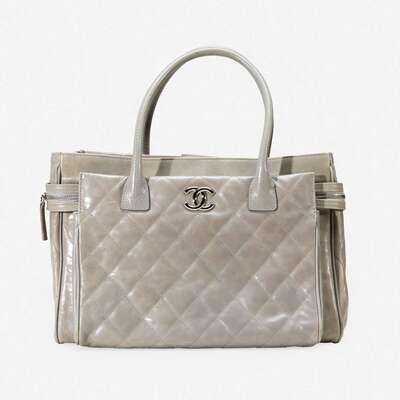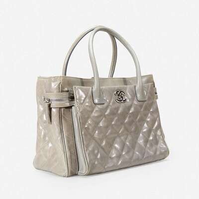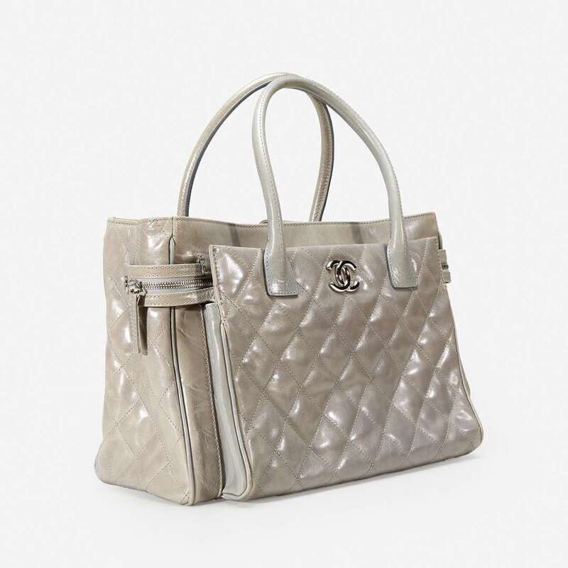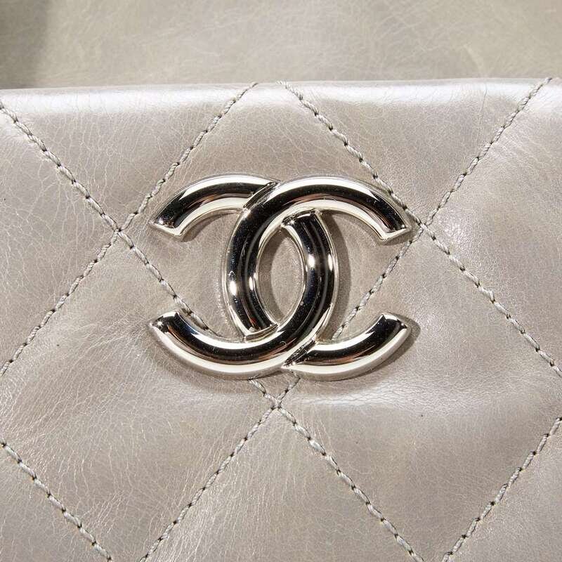the handbag with quilted gray leather exterior and magnetic closure with silver colored hardware and "CC" logo.