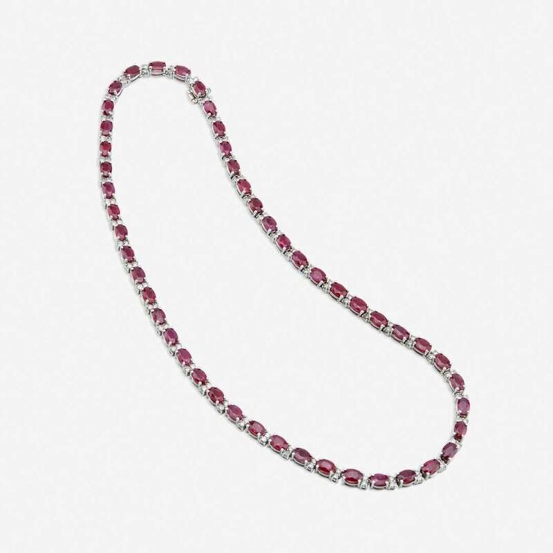 comprised of alternating oval-cut rubies and round brilliant-cut diamonds; estimated total ruby weight: 24.00 carats; estimated total diamond weight: 2.45 carats.