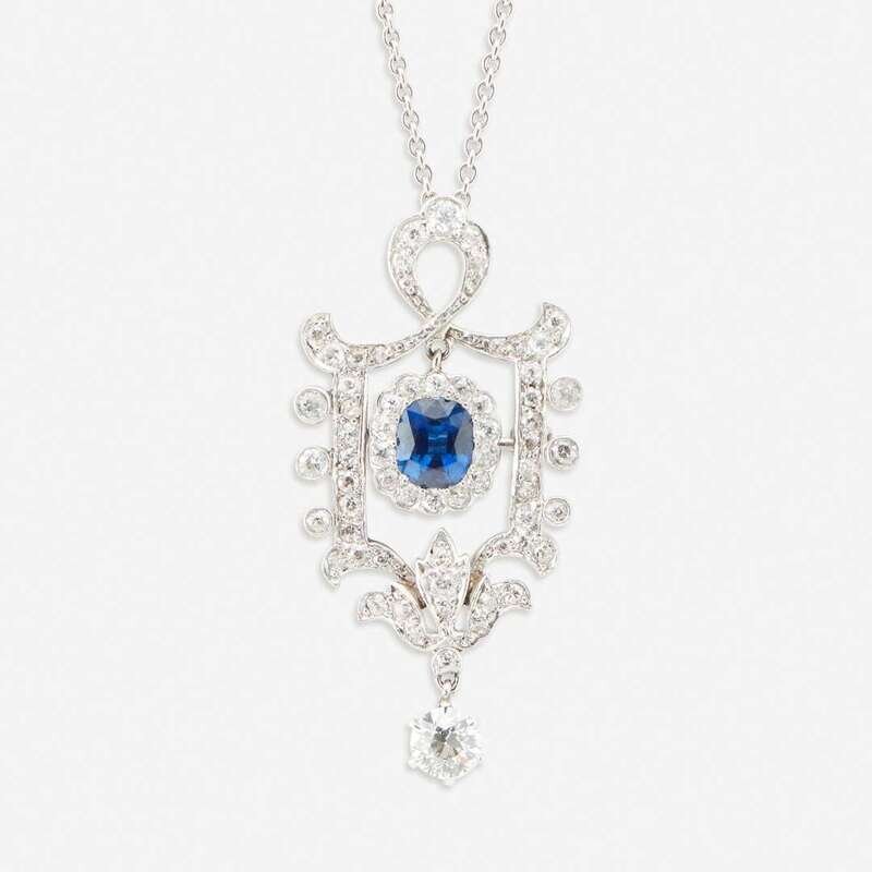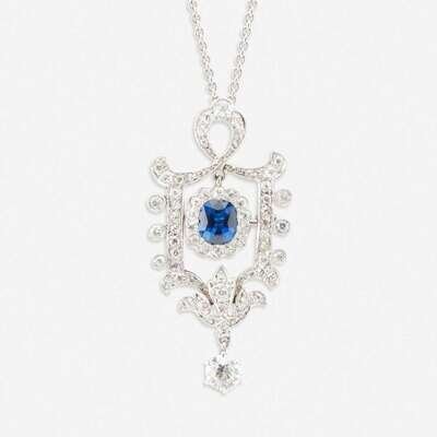 A diamond, sapphire, and platinum pendant/brooch