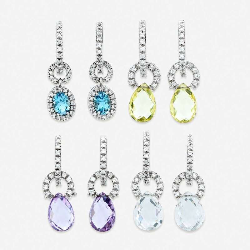 designed as hoops set to the front with round brilliant-cut diamonds, each suspending removable charm set with a faceted yellow quartz, amethyst, rock crystal or aquamarine drop, accented with round brilliant-cut diamonds; estimated total diamond weight: 2.25 carats.