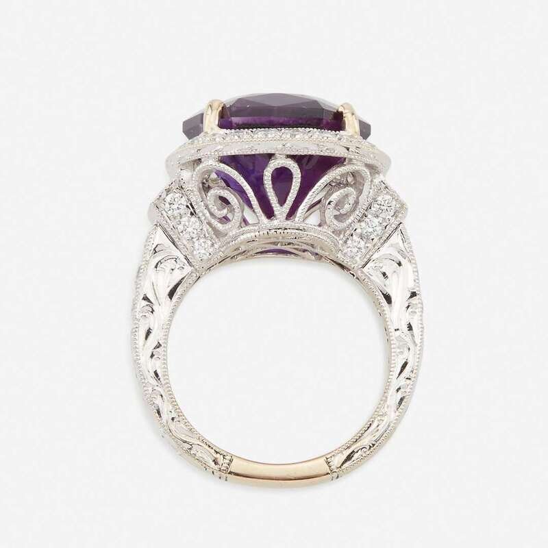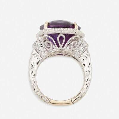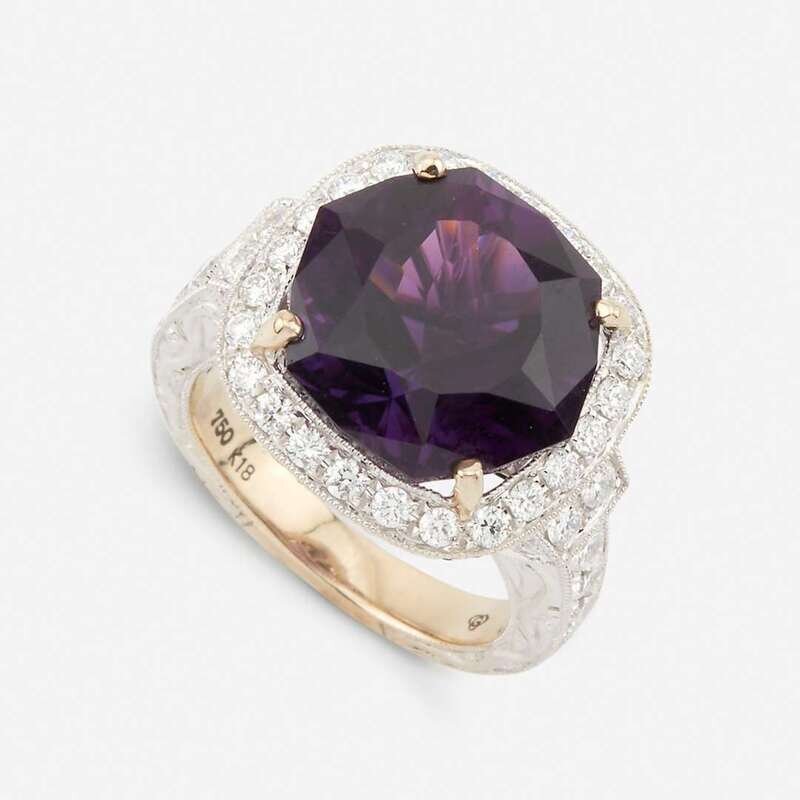 centering a modified hexagonal-cut amethyst, accented by round brilliant-cut diamonds; estimated total diamond weight: 4.10 carats.