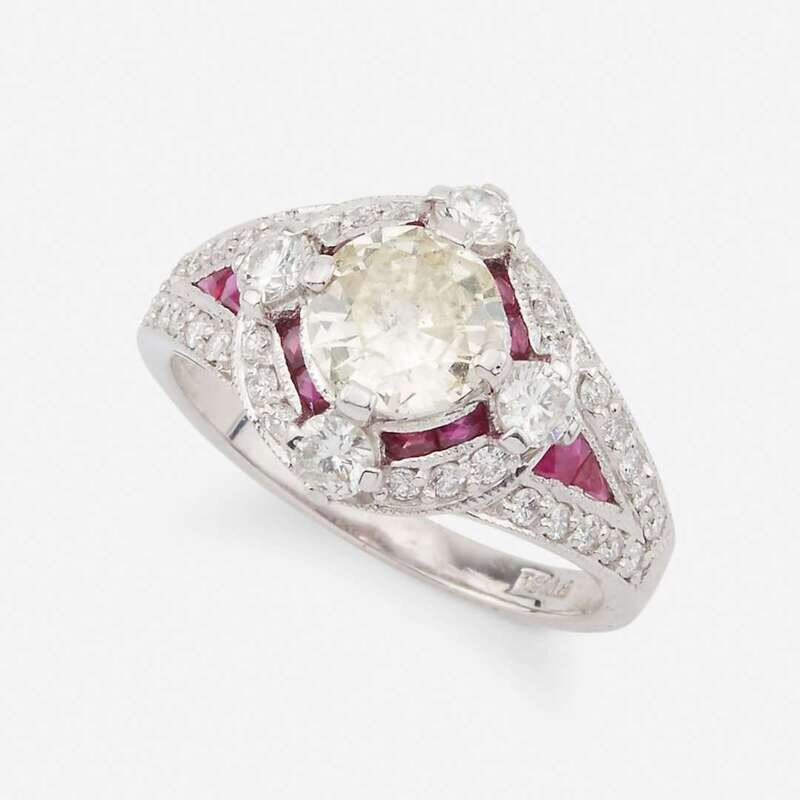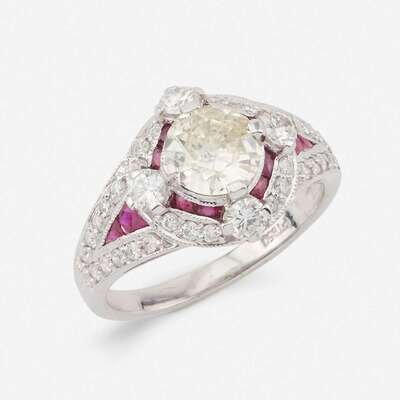 A colored diamond, diamond, ruby, and platinum ring