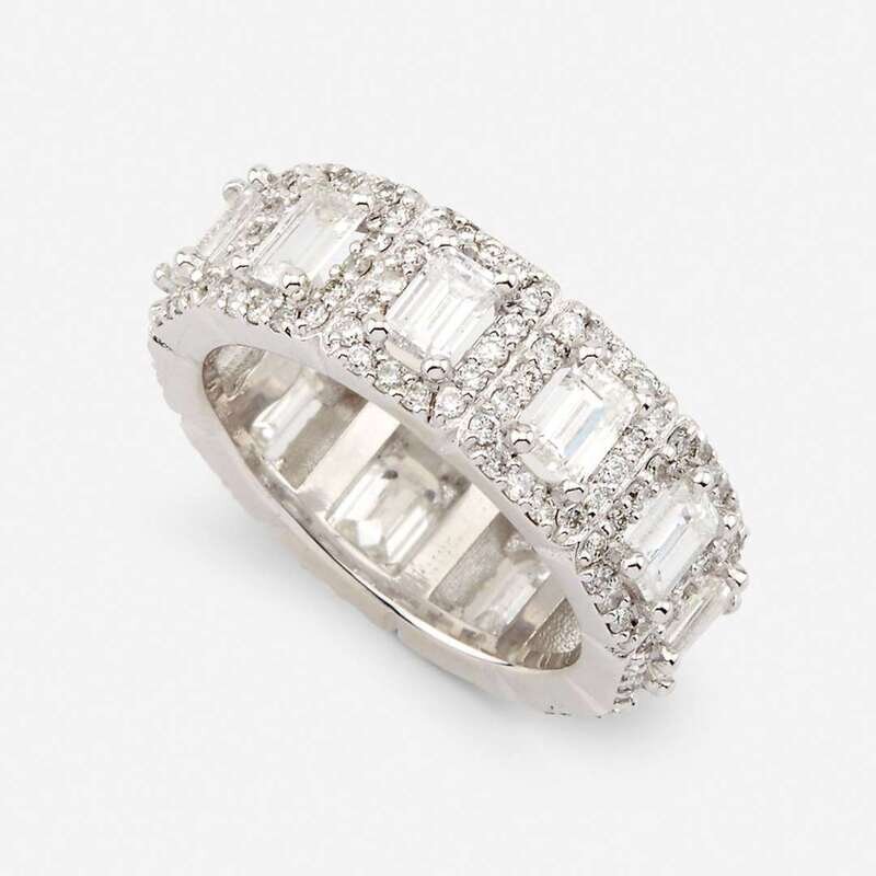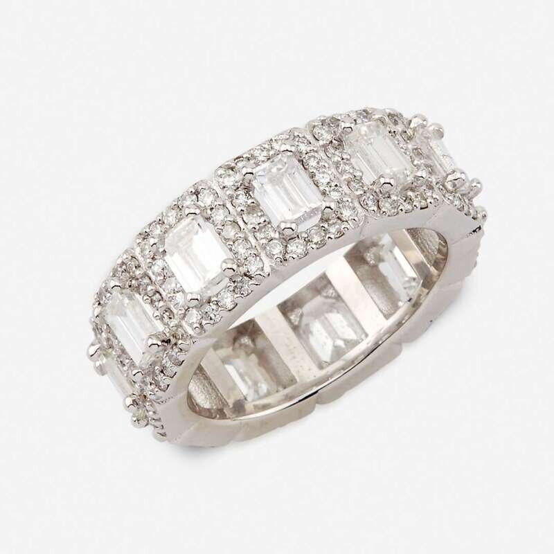 highlighting emerald-cut diamonds; estimated total emerald-cut diamond weight: 2.90 carats, accented by round brilliant-cut diamonds; estimated total remaining diamond weight: 1.20 carats.