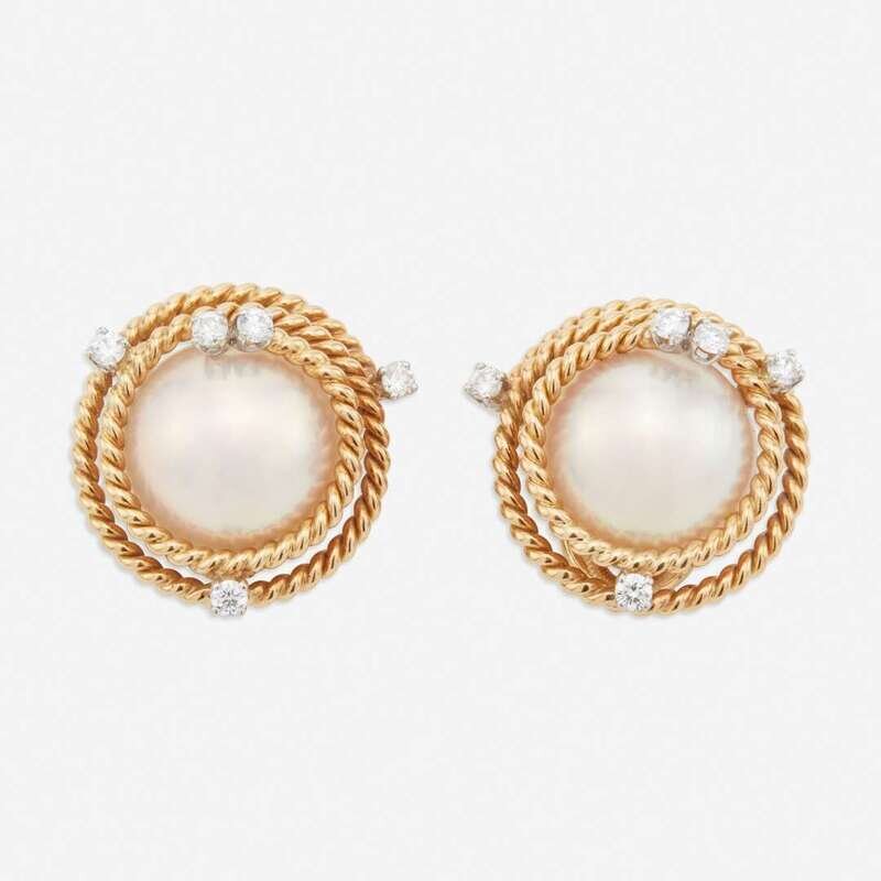 A pair of mabe pearl, diamond, and eighteen karat gold earclips, Tiffany & Co. Schlumberger