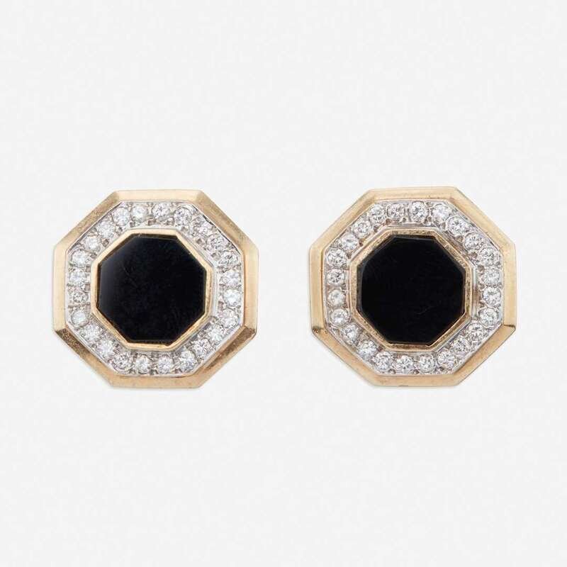 each centering an octagonal onyx tablet, framed by round brilliant-cut diamonds; estimated total diamond weight: 0.90 carat.