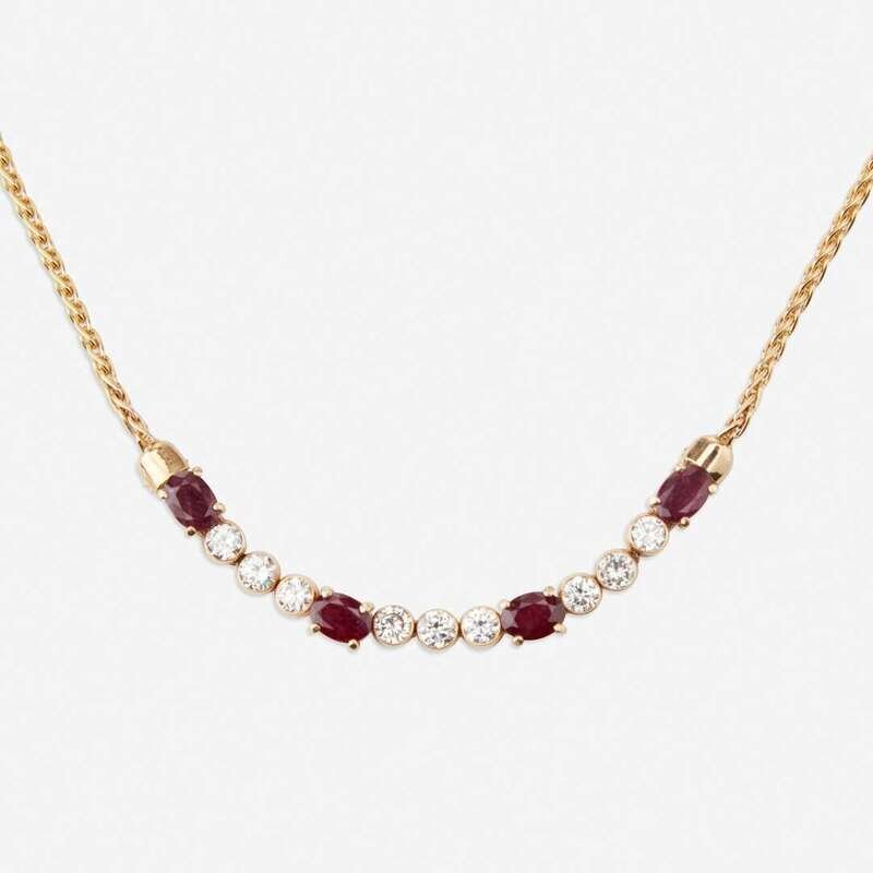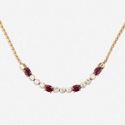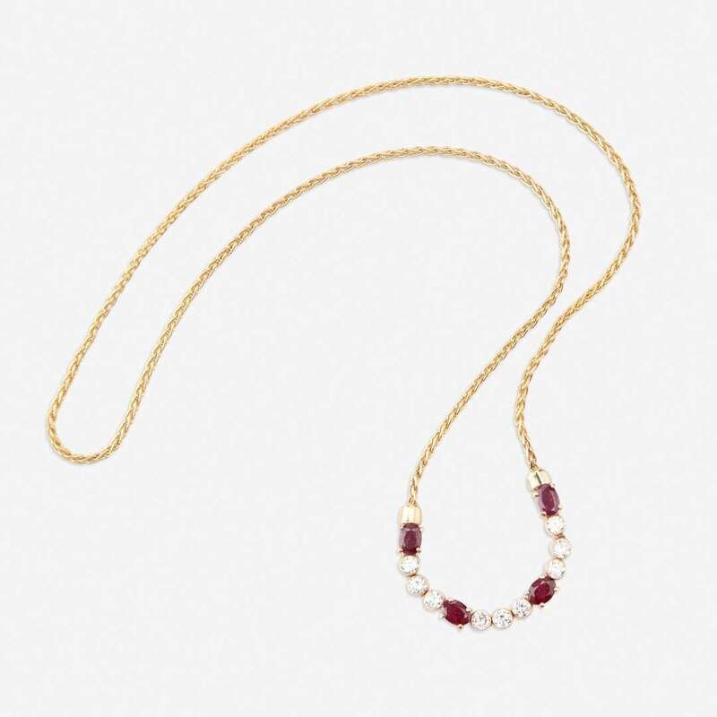 set with four oval-cut rubies measuring approximately 7.00mm x 5.00mm x 3.50mm each, separated by bezel-set round brilliant-cut diamonds; estimated total diamond weight: 1.80 carats, together with interchangable white and yellow fourteen karat gold chains.