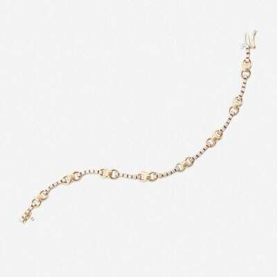 the round brilliant-cut diamond line bracelet accented with fourteen karat gold stations designed as infinity symbols; estimated total diamond weight: 0.75 carat.