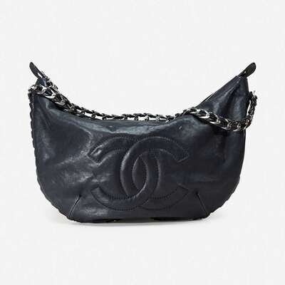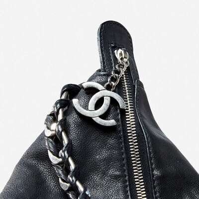 the exterior and interior made of black lambskin leather; logo embroidered on exterior with silver colored chain and leather strap along the entire perimeter and zipper closure.