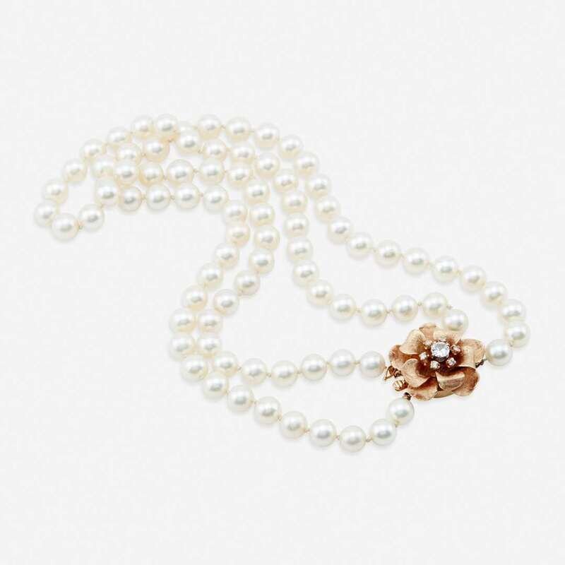 designed as two strands of cultured pearls measuring approximately 8.0mm, completed by a fourteen karat gold clasp designed as a textured flower set with an old European-cut diamond weighing approximately 0.55 carats, surrounded by circular-cut diamonds.