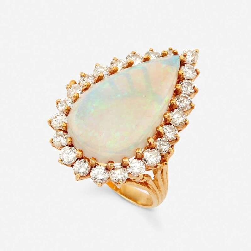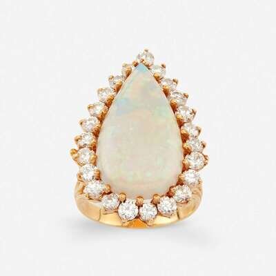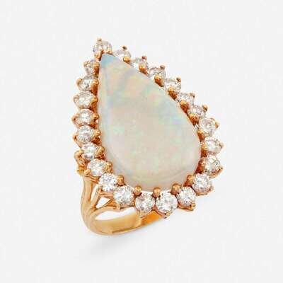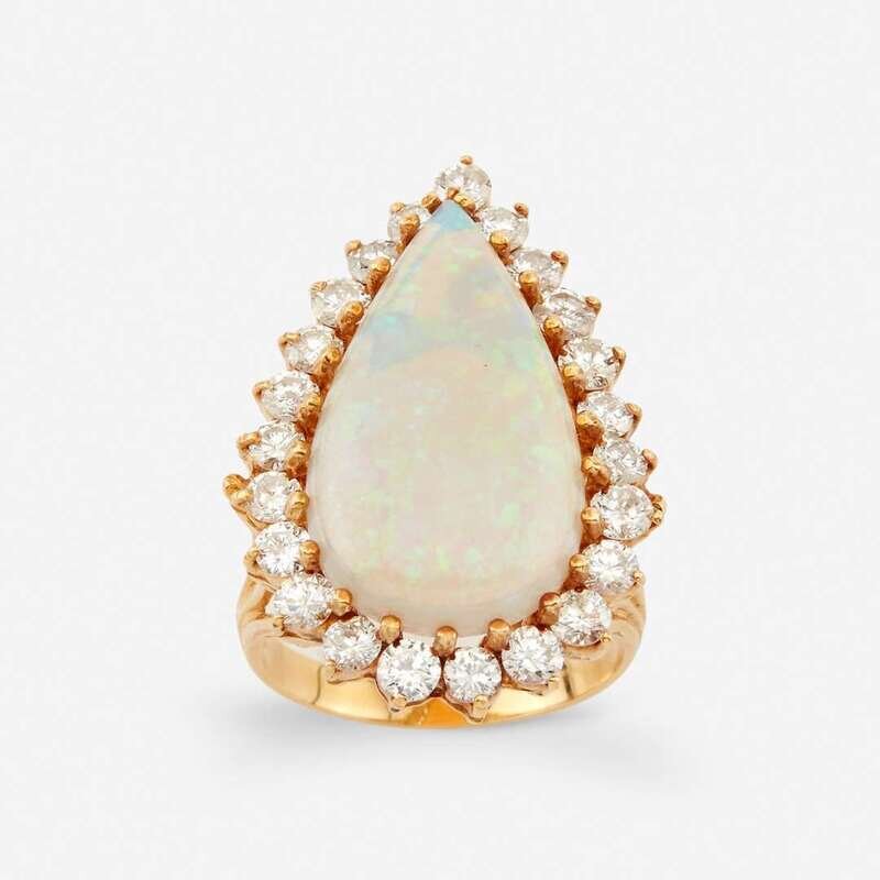 set with a pear-shaped opal measuring approximately 22.3mm x 12.5mm x 4.5mm, surrounded by full-cut diamonds; estimated total diamond weight: 1.60 carats.