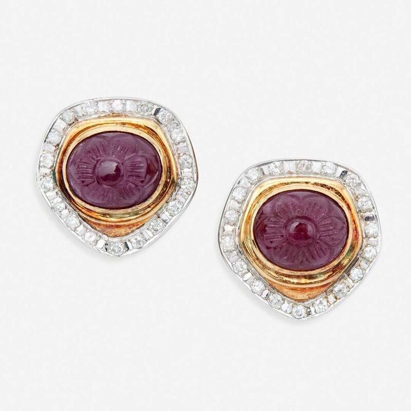 floral carved rubies, each measuring approximately 14.3mm x 12.3mm x 7.3 mm, within fourteen karat gold bezels, framed by round brilliant-cut diamond in platinum; estimated total diamond weight: 1.00 carat.