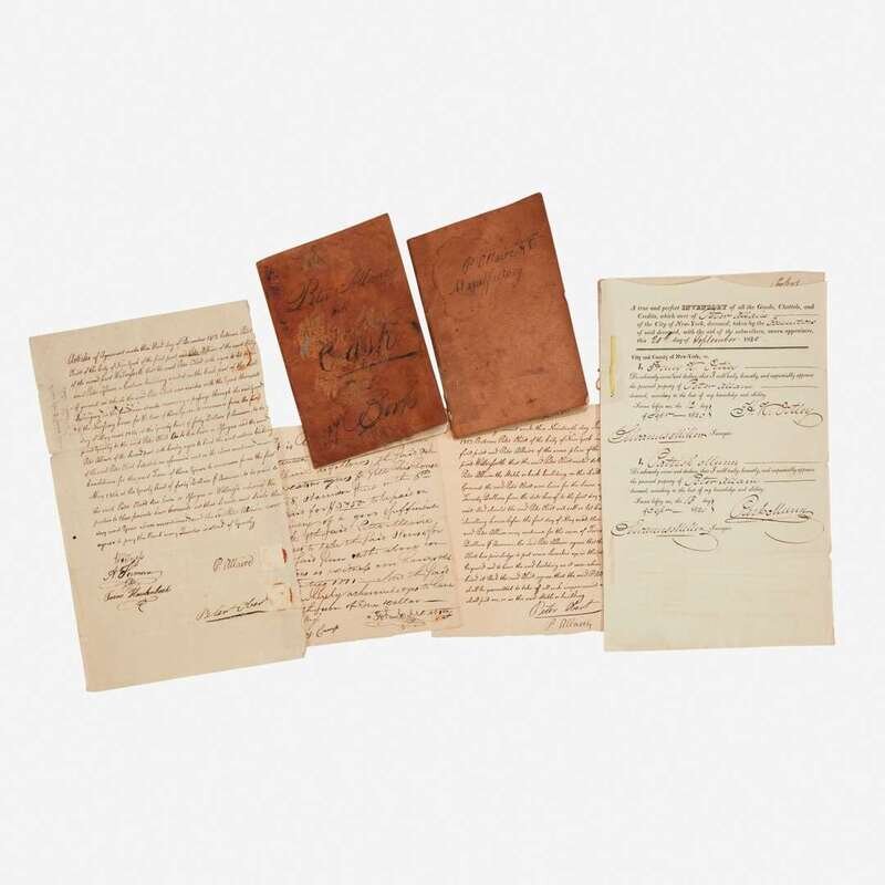 New York, 1803-24. Mini-archive of seven items relating to New York merchant and purported British spy, Peter Alexander Allaire. Comprising his account book, dated 1803-05; three lease aggreements between Allaire and two New York City merchants, dated 1811-13; one partially printed appraisal document of Allaire's property, executed upon his death and signed by his children, George and Calicia Allaire, dated September 20, 1820; one MS. account book belonging to his son George Young Allaire, dated 1823-24; one copy of the quarterly magazine "Now and Then", April, 1948, containing Allaire's first person account of his arrest and imprisonment in the Bastille on suspicions of him being a spy for the British government.