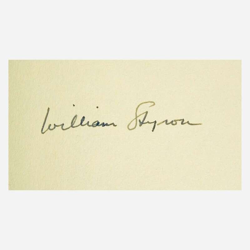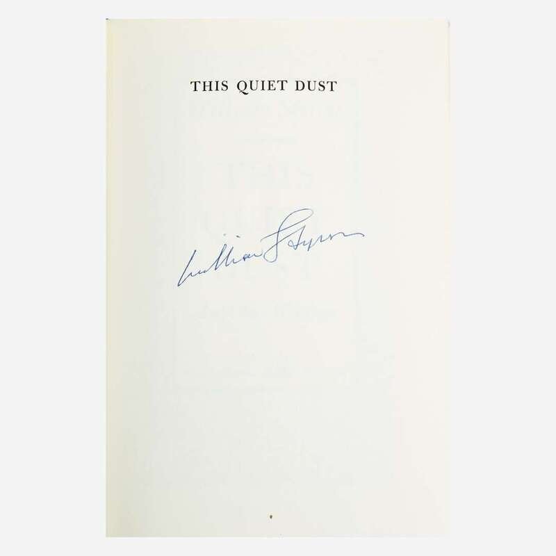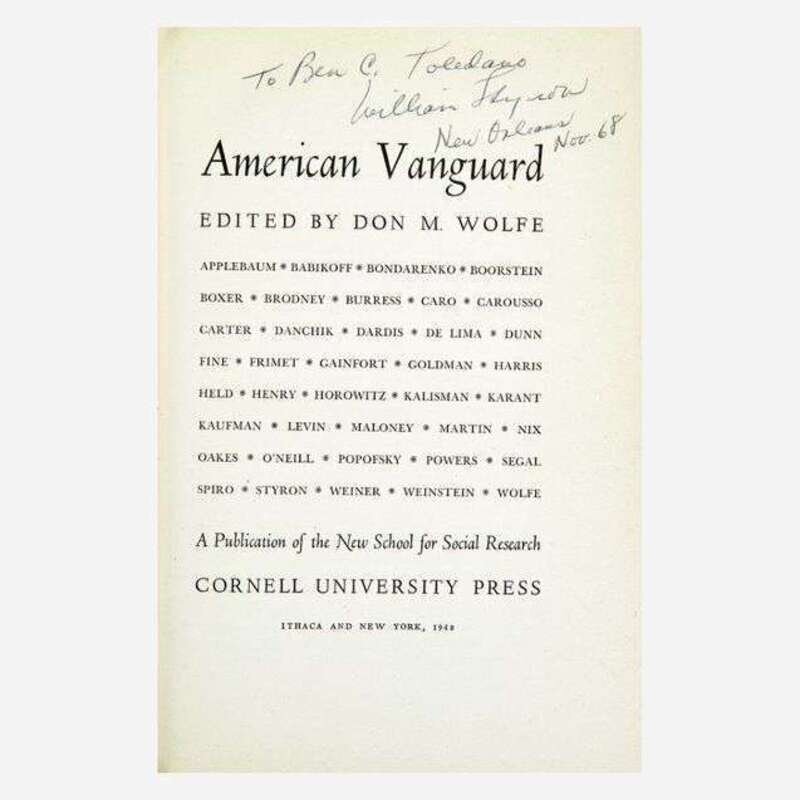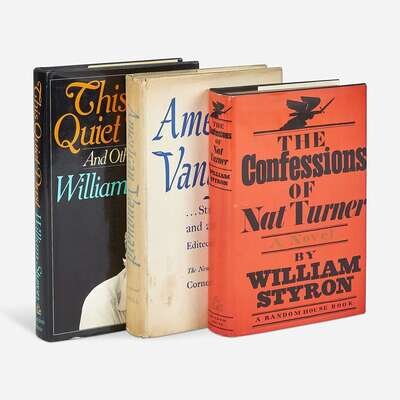 American Vanguard Ithaca and New York: Cornell University Press, 1948. First edition. 8vo. 323 pp. Edited by Don M. Wolfe. Inscribed: "To Ben C. Toledano/William Styron/New Orleans/Nov. 68" on title-page. Original slate gray cloth, stamped in blue; in original unclipped dust-jacket. Styron's short sketch, "A Moment in Trieste", was one of his earliest appeareances in print, aged 23, three years before his debut novel, "Lie Down in Darkness" appeared. Together with: The Confessions of Nat Turner New York: Random House, (1967). First and limited trade edition, one of 150 copies signed by Styron on a tipped-in leaf. 8vo. (429) pp. Original black cloth, stamped in silver, gilt, and orange; tan endpapers, top edge stained red, faded, other edges untrimmed; in original unclipped dust-jacket. A near-fine copy. Together with: This Quiet Dust and Other Writings New York: Random House, (1982). First edition. 8vo. 305 pp. Signed by Styron on half-title. Original black cloth stamped in gilt; in original unclipped dust-jacket. A near-fine copy.